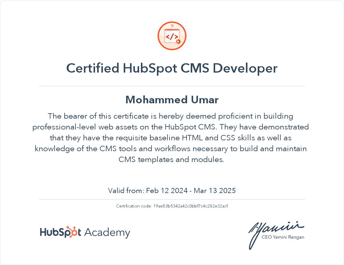 7+ years of specialized HubSpot CMS development experience, Certified proficiency, and a focus on clear communication and reliable delivery.